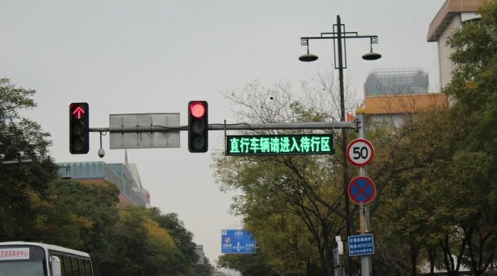 為了提高路口通行能力。在路口設(shè)置的直行設(shè)施,當(dāng)行駛至這類路口的車輛遇直行和左轉(zhuǎn)彎信號(hào)放行時(shí),路口一側(cè)紅綠燈路燈桿上的引導(dǎo)電子屏?xí)m時(shí)顯示“請(qǐng)直行車輛進(jìn)入待行區(qū)等候放行”的提示,此時(shí),直行車輛可以進(jìn)入路口施劃的待行區(qū)等待綠燈放行后即可通行。